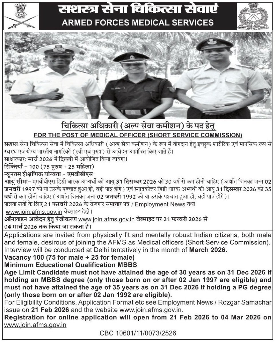 AFMS Medical Officer Vacancy 2026: The Armed Forces Medical Services (AFMS) has released a notification for the Medical Officer posts. All interested and eligible candidates must read the AFMS Medical Officer Vacancy 2026 notification carefully and submit their applications before the prescribed deadline. See all information related to the AFMS Medical Officer Vacancy 2026 post on the official website https://join.afms.gov.in/. All the details related to the AFMS Medical Officer Vacancy 2026 are provided below.