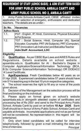 APS Ambala Cantt Recruitment 2026: Army Public School (APS), Ambala Cantt, has released an offline recruitment notification for teaching and non-teaching positions—including PGT (English, IP, Hindi, Commerce, Physical Education, Political Science), TGT (Social Science, Hindi, Computer, Special Educator, Counselor), PRT (All Subjects, Computer Instructor, Lab Instructor, Balvatika Teacher), LDC (Lower Division Clerk), and Accountant posts. The offline application process commenced on March 31, 2026, and the deadline for submission is April 10, 2026. The application fee is ₹250, which must be paid via Demand Draft (DD). Complete details regarding the APS Ambala Cantt Recruitment 2026—including post-wise eligibility criteria, fees, address, and the application form link—are provided below.