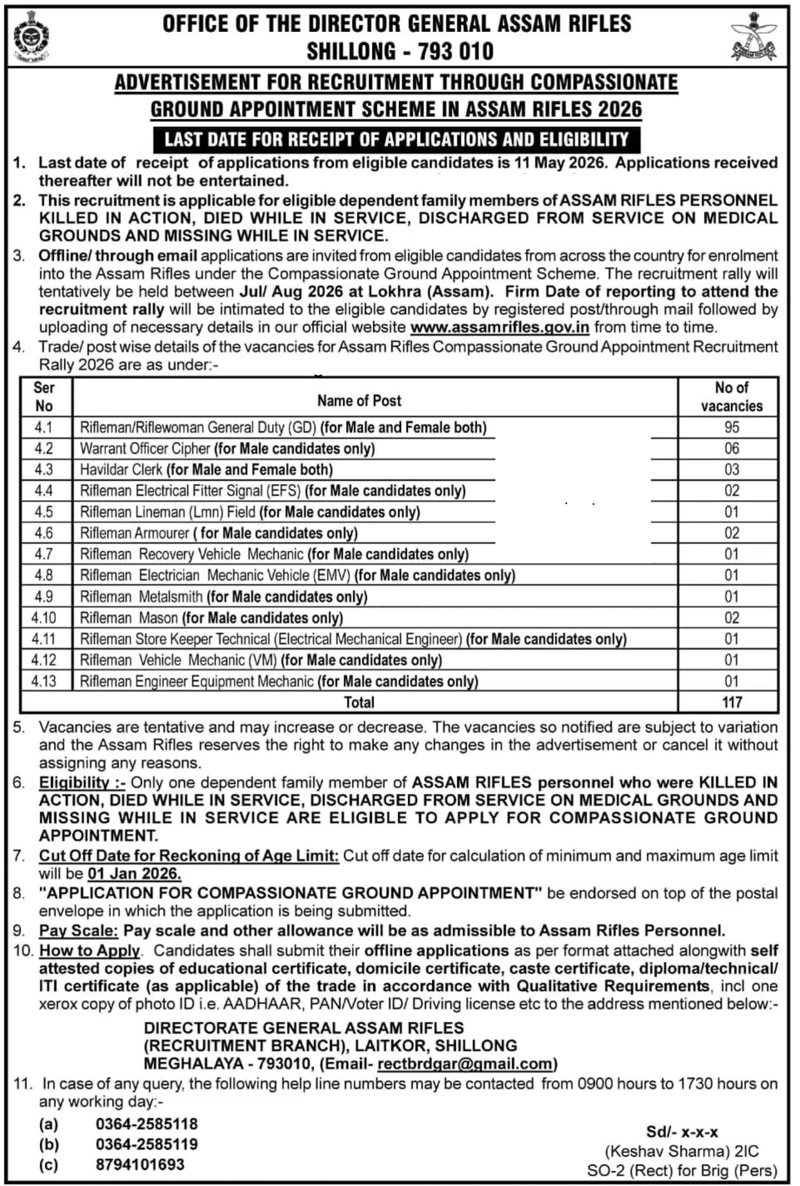 Assam Rifles Compassionate Appointment Recruitment 2026: The Office of the Director General, Assam Rifles, Shillong (Meghalaya), has issued an offline recruitment notification for 117 posts under the Compassionate Ground Appointment Scheme 2026. This recruitment is exclusively for eligible dependent family members of Assam Rifles personnel who were killed in action, died while in service, were discharged on medical grounds, or went missing during service. The posts include Rifleman/Riflewoman GD (95 posts), Warrant Officer Cipher (6), Havildar Clerk (3), and various technical posts. Applications must be submitted either offline or via email. The deadline for submitting applications is May 11, 2026. The recruitment rally is tentatively scheduled to be held in July/August 2026 at Lokhra, Assam. Comprehensive details regarding the Assam Rifles Compassionate Ground Recruitment 2026—including eligibility criteria, post-wise vacancies, the mailing address, and the application process are provided below.