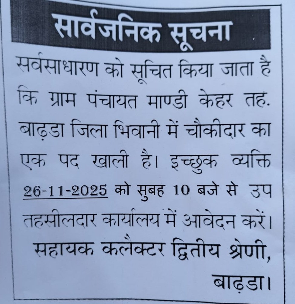 Bhiwani Chowkidar Recruitment 2025: The Office of the Deputy Tehsildar has released a notification for the Chowkidar posts. All interested and eligible candidates must read the Bhiwani Chowkidar Recruitment 2025 notification carefully and submit their applications before the prescribed deadline. See all information related to Bhiwani Chowkidar Recruitment 2025 post on the official website. All the details associated with the Bhiwani Chowkidar Recruitment 2025 are given below.