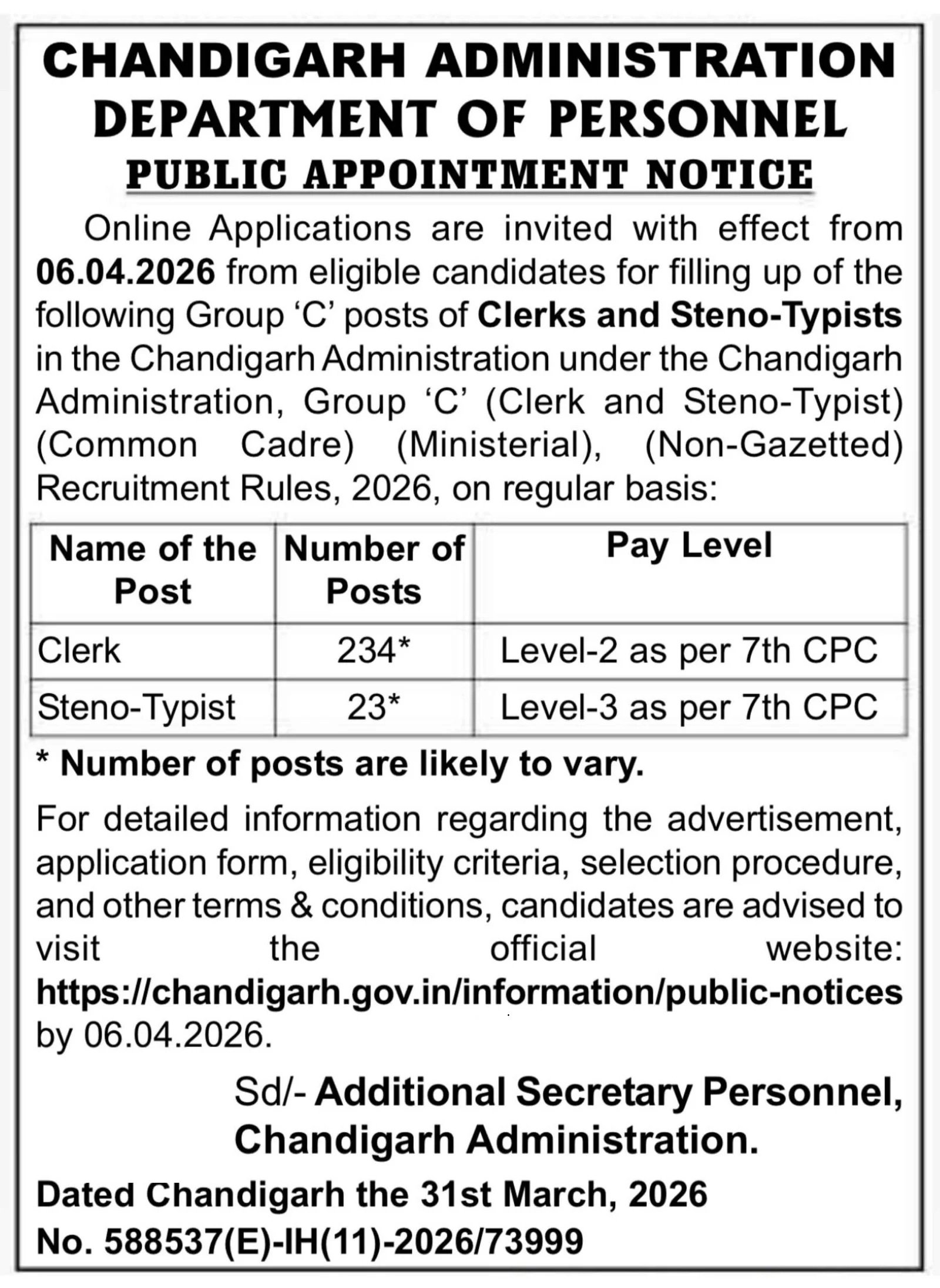 Chandigarh Administration Clerk Steno Typist Recruitment 2026: Chandigarh Administration has released a short notification for 257 posts of Group C (Ministerial, Non-Gazetted) — which includes Clerk: 234 posts and Steno Typist: 23 posts. Both posts are on a regular basis. A graduate degree is necessary for this recruitment – Typing for Clerk and shorthand skill for Steno Typist is also required. Age limit is 18 to 27 years — age calculation date is 1 January 2026. The online application will start from 6 April 2026 — the last date will be updated as soon as the official notification comes. Complete details of Chandigarh Administration Clerk, Steno Typist Recruitment 2026 — post-wise vacancy, eligibility, selection process, and direct apply link — are given below.