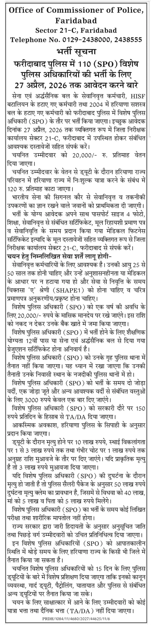 Faridabad Police SPO Recruitment 2026: The Office of the Commissioner of Police, Faridabad, has released a notification for the Special Police Officer posts. All interested and eligible candidates must read the Faridabad Police SPO Recruitment 2026notification carefully and submit their applications before the prescribed deadline. See all information related to the Faridabad Police SPO Recruitment 2026 post on the official website. All the details associated with the Faridabad Police SPO Recruitment 2026 are given below.