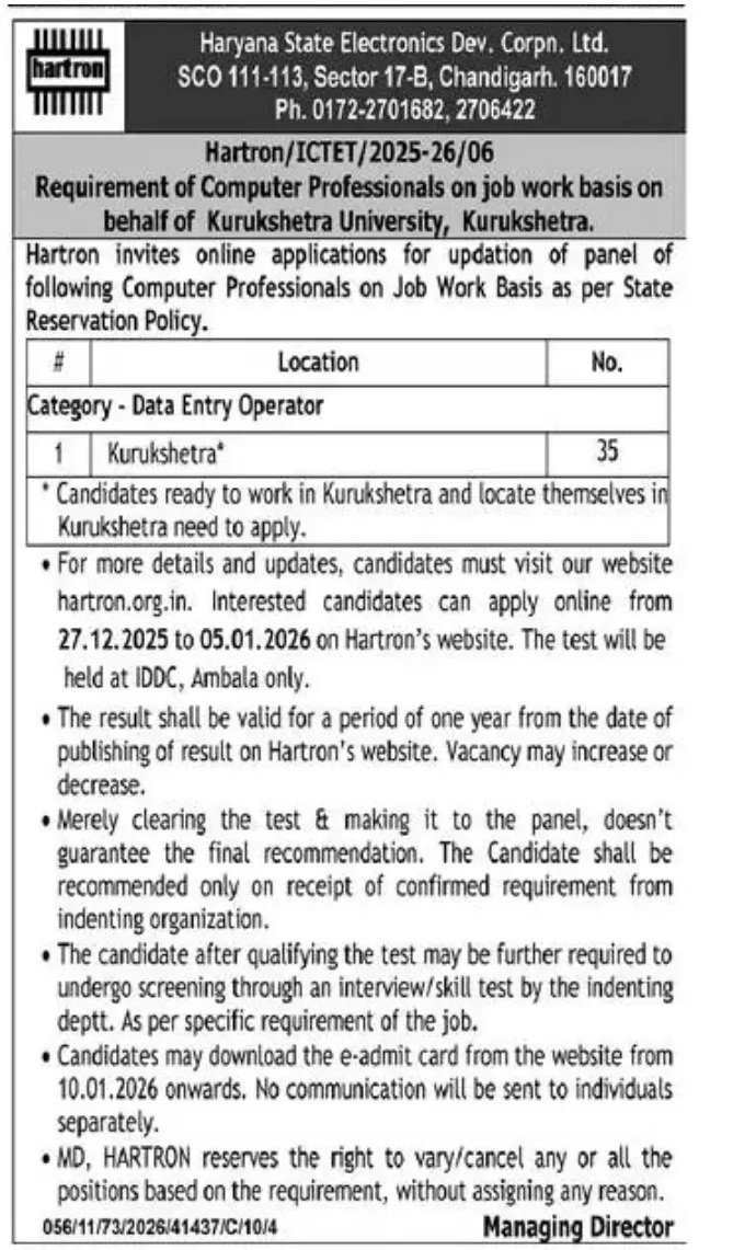 Hartron DEO Recruitment 2026: The Haryana State Electronics Development Corporation Ltd. has released a notification for the DEO (Data Entry Operator) posts. All interested and eligible candidates must read the Hartron DEO Recruitment 2026 notification carefully and submit their applications before the prescribed deadline. See all information related to the Hartron DEO Recruitment 2026 post on the official website hartronservices.com. All the details related to the Hartron DEO Recruitment 2026 are provided below.