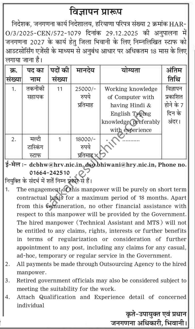 Haryana Census Department Recruitment 2026: The Haryana Census Operations Directorate, Bhiwani has released a notification for the Technical Assistant & MTS posts. All interested and eligible candidates must read the Haryana Census Department Recruitment 2026 notification carefully and submit their applications before the prescribed deadline. See all information related to the Haryana Census Department Recruitment 2026 post on the official website. All the details related to the Haryana Census Department Recruitment 2026 are provided below.