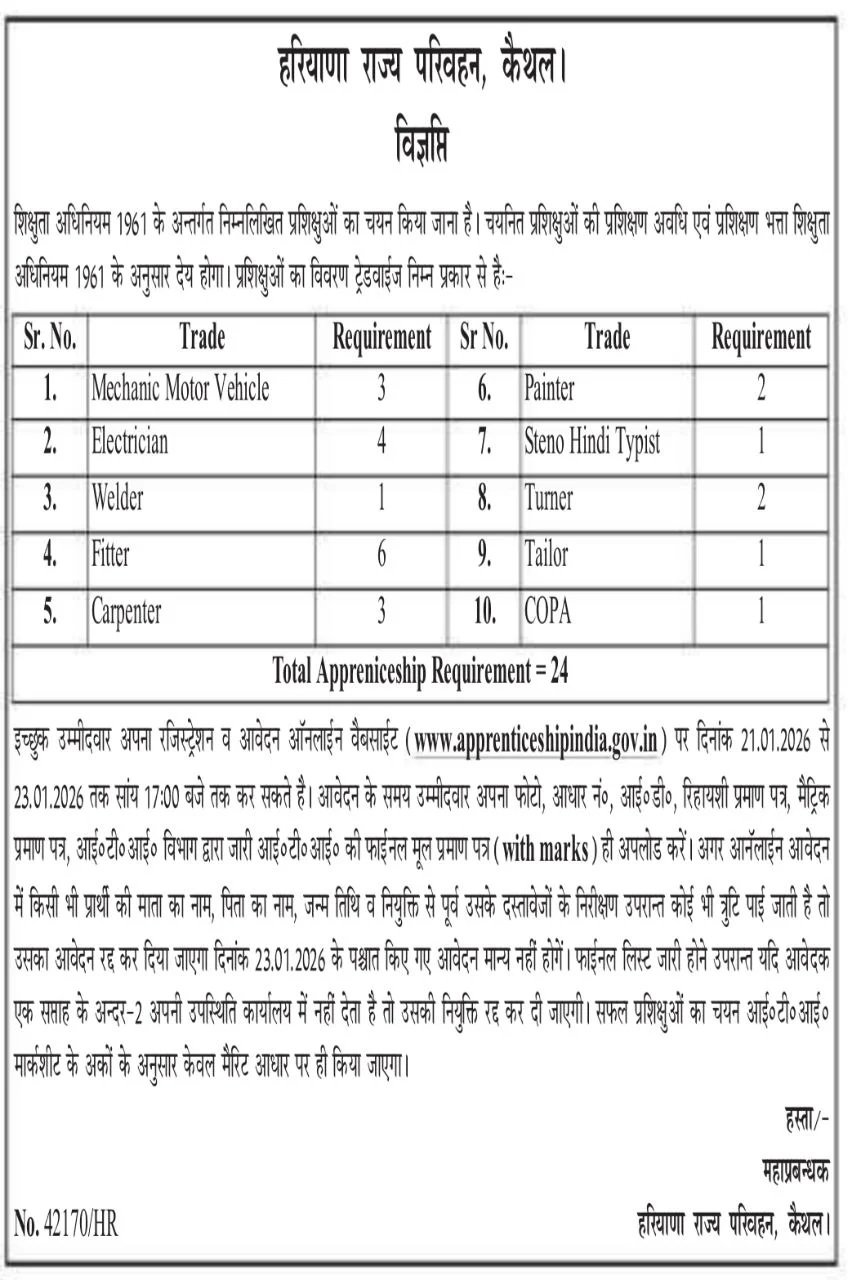 | Haryana Roadways Kaithal Apprentice 2026 Job Summary | |