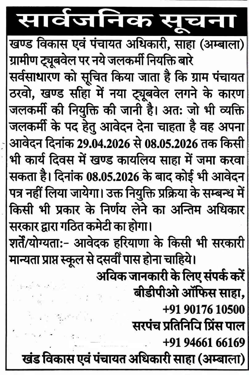 Haryana Tubewell Operator Recruitment 2026: Block Development and Panchayat Officer, Block Saha, District Ambala, Haryana has issued a notification for the position of Tubewell Operator. All eligible and interested candidates are advised to carefully read the official notification and apply before 08-05-2026, the last Date. All relevant information regarding the Haryana Tubewell Operator Recruitment 2026 is provided below.
