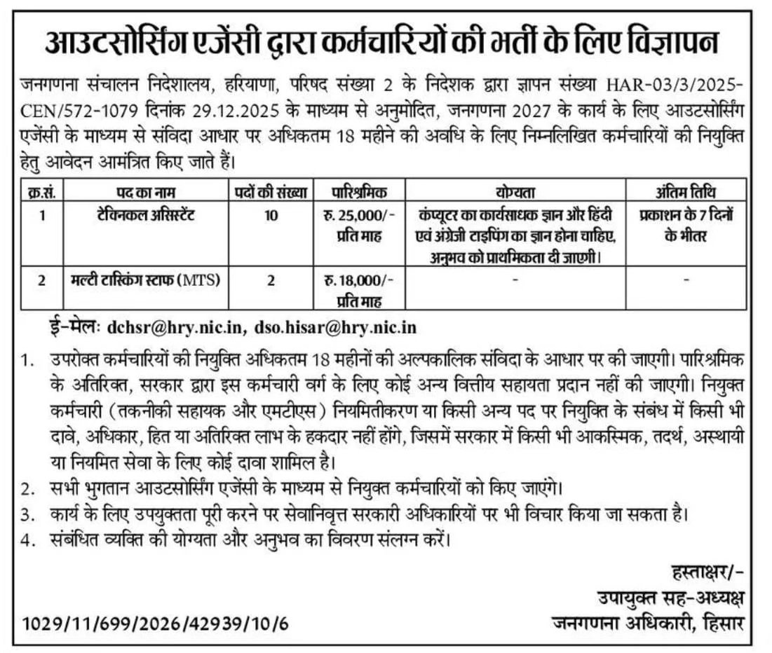 Hisar Census Department Recruitment 2026