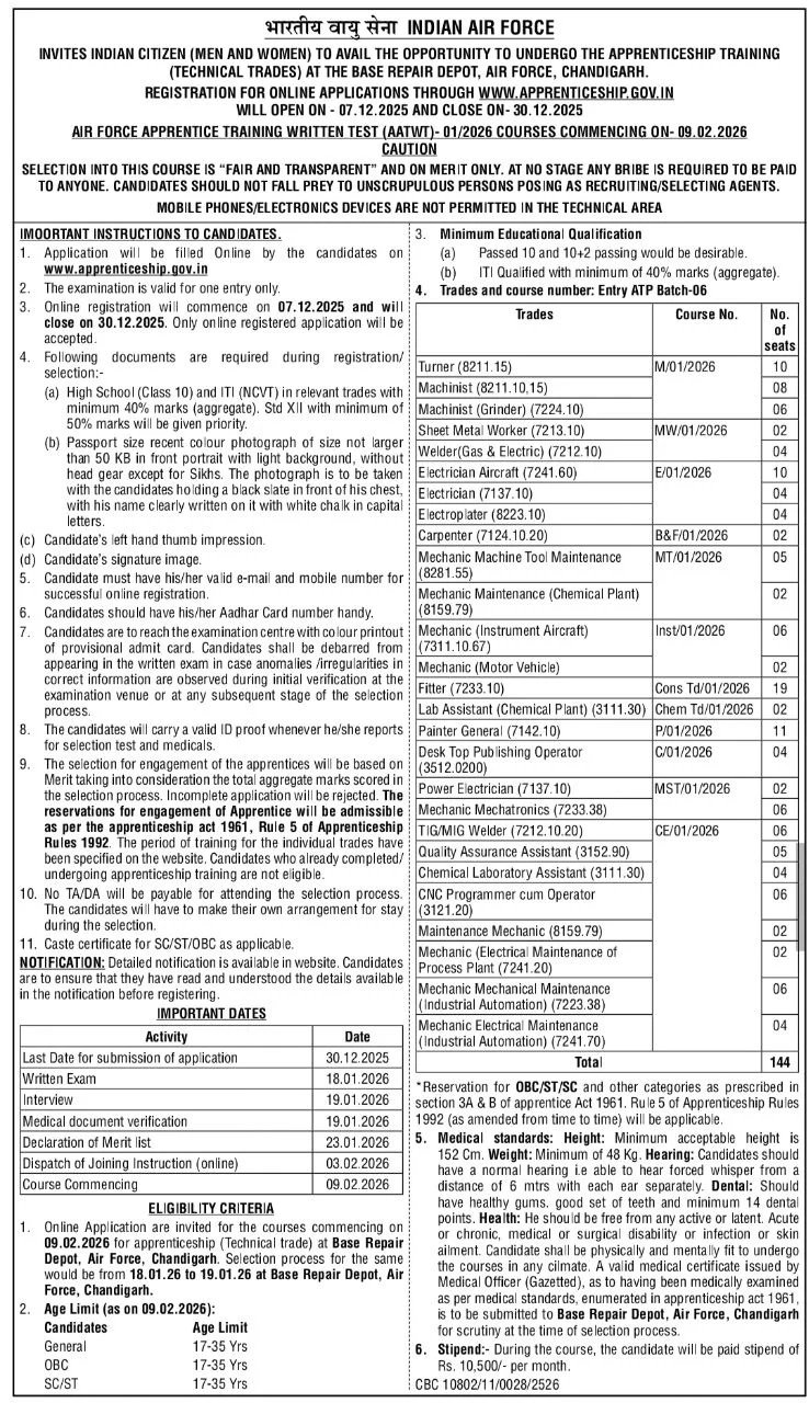 Indian Air Force Chandigarh Apprentice Recruitment 2025: The Indian Air Force has released a notification for the Apprentice posts. All interested and eligible candidates must read the Indian Air Force Chandigarh Apprentice Recruitment 2025 notification carefully and submit their applications before the prescribed deadline. See all information related to Indian Air Force Chandigarh Apprentice Recruitment 2025 post on the official website Indian Air Force. All the details associated with the Indian Air Force Chandigarh Apprentice Recruitment 2025 are given below.