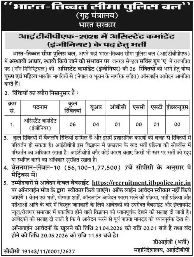 ITBP Assistant Commandant Vacancy 2026: Indo-Tibetan Border Police Force (ITBP) has issued a notification for the position of Assistant Commandant. The recruitment drive comprises 06 vacancies. All eligible and interested candidates are advised to carefully read the official notification and apply before 20-05-2026, the last Date. All relevant information regarding the ITBP Assistant Commandant Vacancy 2026 recruitment is provided below.