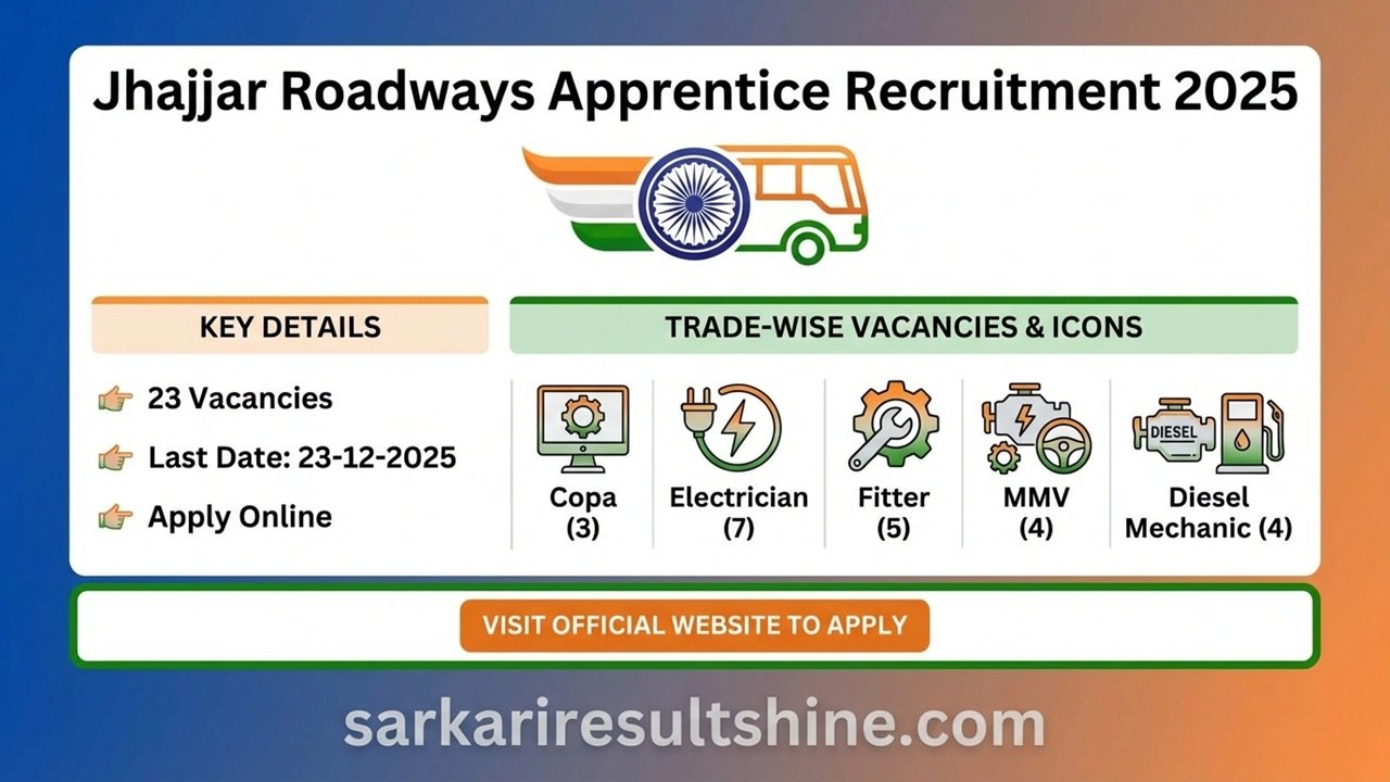 Jhajjar Roadways Apprentice Recruitment 2025: The General Manager of Haryana Roadways (Jhajjar) has released a notification for the Apprentice posts. All interested and eligible candidates must read the Jhajjar Roadways Apprentice Recruitment 2025 notification carefully and submit their applications before the prescribed deadline. See all information related to Jhajjar Roadways Apprentice Recruitment 2025 post on the official website . All the details related to the Jhajjar Roadways Apprentice Recruitment 2025 are provided below.