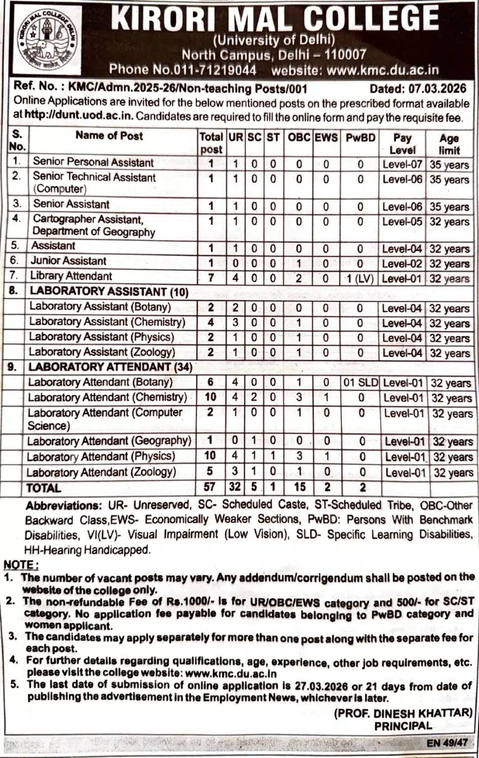 Kirori Mal College Vacancy 2026: The Kirori Mal College, under the University of Delhi, has released a notification for the Non-Teaching posts. All interested and eligible candidates must read the Kirori Mal College Vacancy 2026 notification carefully and submit their applications before the prescribed deadline. See all information related to the Kirori Mal College Vacancy 2026 post on the official website https://kmc.du.ac.in/. All the details related to the Kirori Mal College Vacancy 2026 are provided below.
