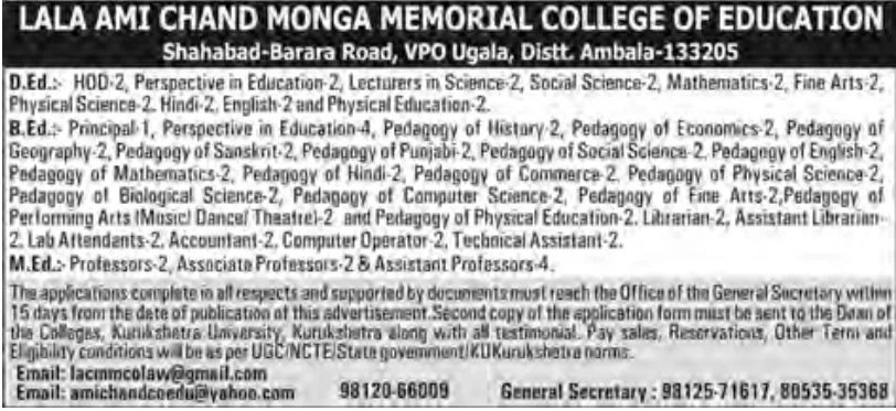 - Send Application Form: “The General Secretary, Lala Ami Chand Monga Memorial College of Education, Shahabad-Barara Road, VPO Ugala, District Ambala, Haryana – 133205.”