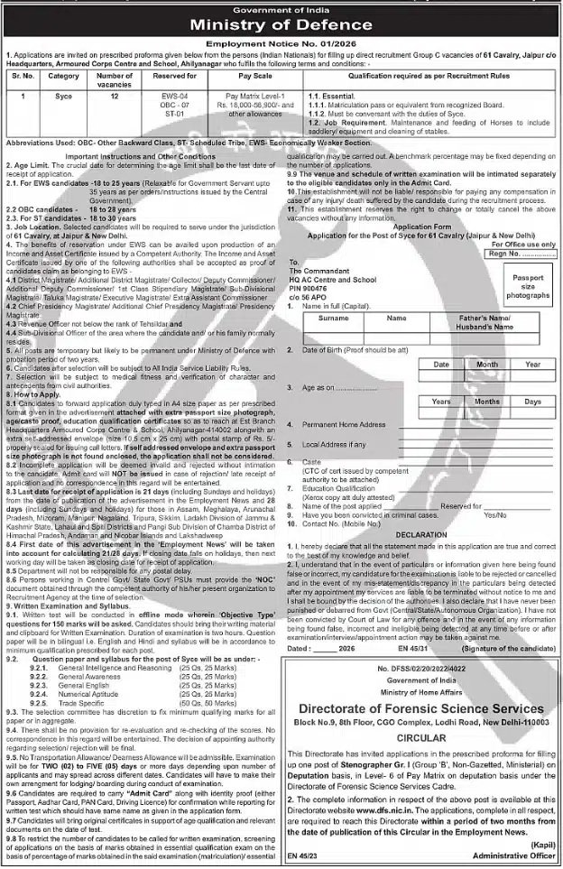 Ministry of Defence Notification Group C (Syce) 2026 Age Limit