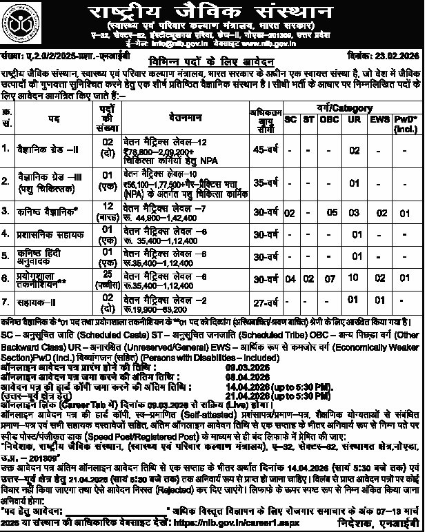 National Institute of Biologicals Recruitment 2026: The National Institute of Biologicals has released a notification for the Scientist Grade-II, Scientist Grade-II, Junior Scientist, Administrative Assistant, Junior Hindi Translator, Laboratory Technician, Assistant-II posts. All interested and eligible candidates must read the National Institute of Biologicals Recruitment 2026 notification carefully and submit their applications before the prescribed deadline. See all information related to the National Institute of Biologicals Recruitment 2026 post on the official website https://nib.gov.in/. All the details related to the National Institute of Biologicals Recruitment 2026 are provided below.