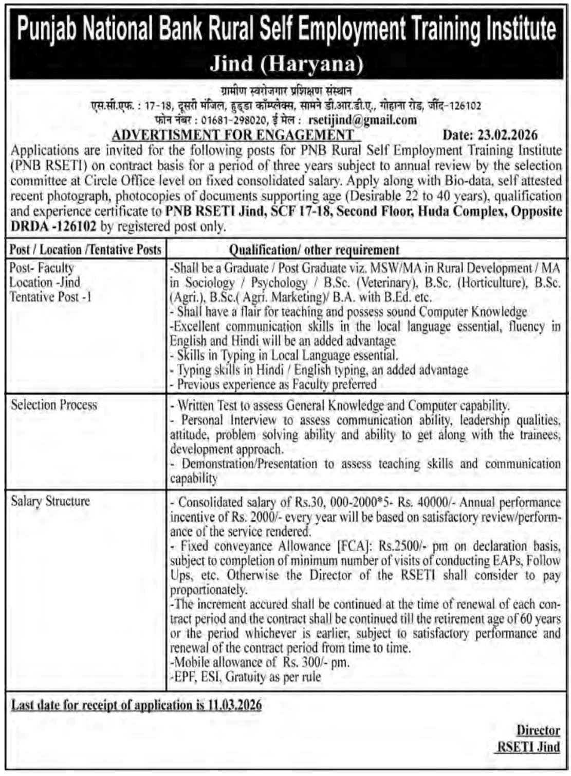 PNB Bank Jind Recruitment 2026: The Punjab National Bank Rural Self Employment Training Institute (PNB RSETI) Jind has released a notification for the Faculty posts. All interested and eligible candidates must read the PNB Bank Jind Recruitment 2026 notification carefully and submit their applications before the prescribed deadline. See all information related to the PNB Bank Jind Recruitment 2026 post on the official website. All the details related to the PNB Bank Jind Recruitment 2026 are provided below.