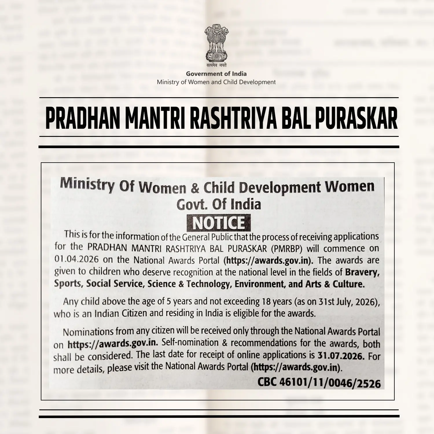 pradhan mantri rashtriya bal puraskar 2026