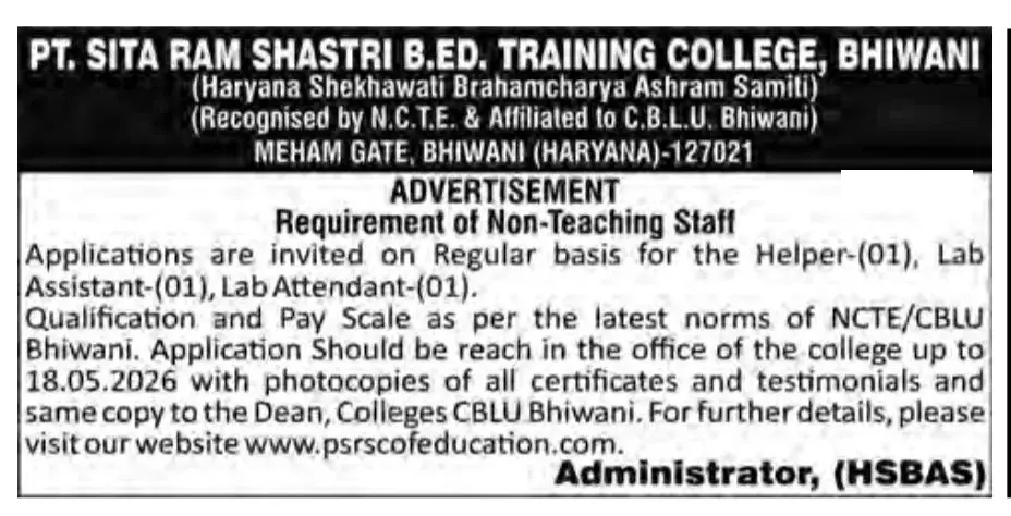 PTSRS College Bhiwani Recruitment 2026: Pt. Sita Ram Shastri B.Ed. Training College, Bhiwani has issued a notification for the position of Helper, Lab Assistant, and Lab Attendant Posts. All eligible and interested candidates are advised to carefully read the official notification and apply before 18-05-2026, the last Date. All relevant information regarding the PTSRS College Bhiwani Recruitment 2026 is provided below.