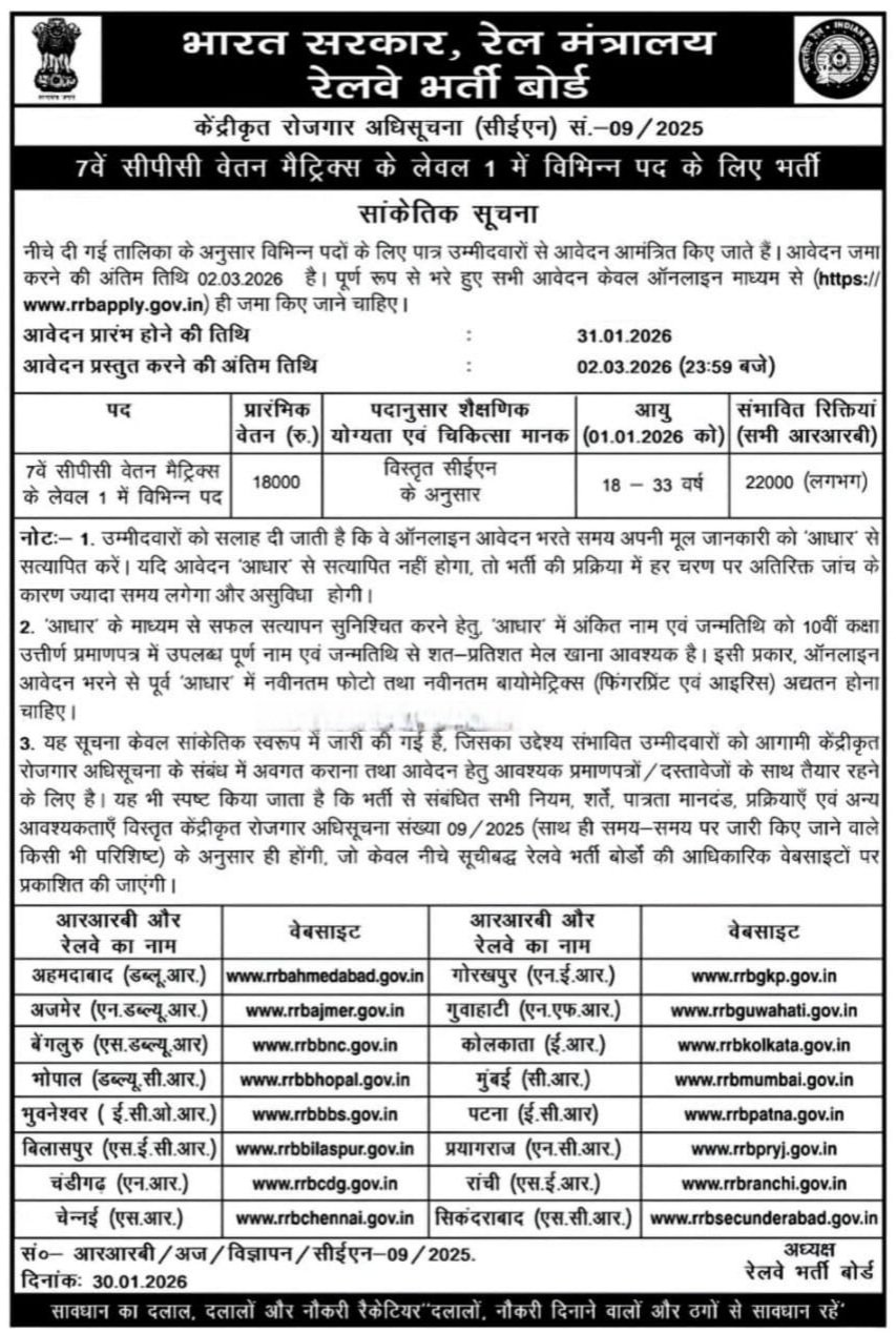 RRB Group D Recruitment 2026: The Railway Recruitment Board (RRB) has released a notification for various posts in the Level 1 (Group D) category. All interested and eligible candidates must read the RRB Group D Recruitment 2026 notification carefully and submit their applications before the prescribed deadline. See all information related to the RRB Group D Recruitment 2026 post on the official website https://indianrailways.gov.in/. All the details related to the RRB Group D Recruitment 2026 are provided below.