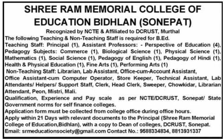 - Send Application Form: Shree Ram Memorial College of Education, Bidhlan, Sonepat (Haryana)