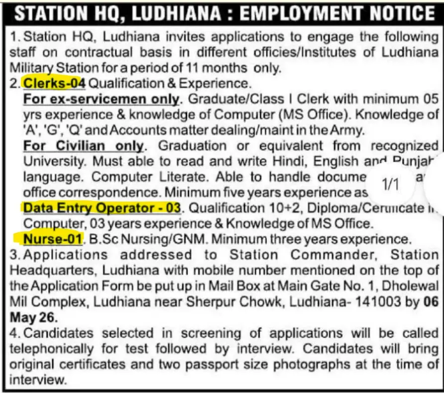 Station HQ Ludhiana Vacancy 2026: Army Station Headquarters, Ludhiana has issued a notification for the positions of Clerk, Data Entry Operator, Nurse. The recruitment drive comprises 08 vacancies. All eligible and interested candidates are advised to carefully read the official notification and apply before 06-05-2026, the last Date. All relevant information regarding the Station HQ Ludhiana Vacancy 2026 recruitment is provided below.