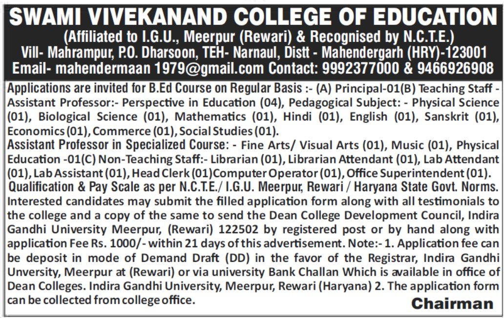- Send Application Form: SWAMI VIVEKANAND COLLEGE OF EDUCATION Vill- Maharampur, P.O. Dharsoon, TEH- Narnaul, Distt – Mahendergarh (HRY)-123001
