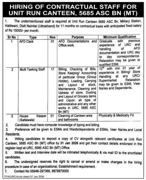 - Send Application Form: “Unit Run Canteen, 5685 ASC Bn (MT) Military Station, Haldwani, Distt. Nainital (Uttarakhand)”